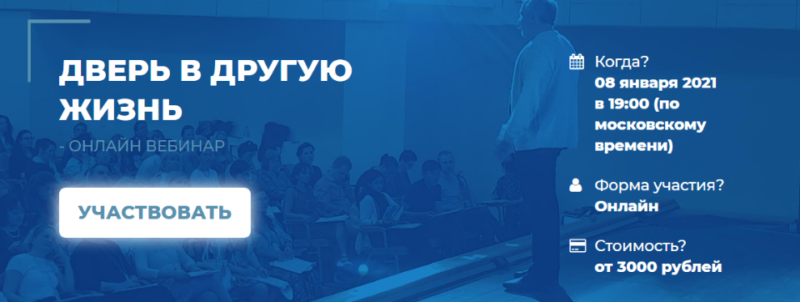 Несмотря на всю эксклюзивность, вебинар под символичным названием «Дверь в другую жизнь» рассчитан на самые широкие группы и слои людей. Единственным условием участия в этом мероприятии является настоятельное желание изменить свою жизнь в лучшую сторону.
