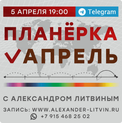 В среду 5 апреля 2023 года в закрытом Телеграм-канале в прямом эфире состоится наша очередная видеосессия "АПРЕЛЬ 2023. ПЛАНЕРКА С АЛЕКСАНДРОМ ЛИТВИНЫМ". Александр Богданович даст анализ предстоящему периоду и ответит на ваши вопросы.