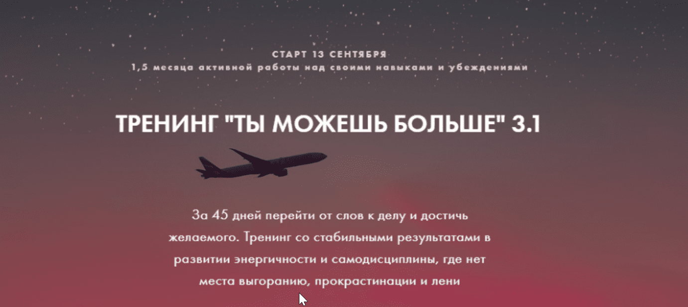 Тренинг идет уже 2,5 года, в мае стартует двенадцатый поток. Это новый и обновленный тренинг, его третья версия (с дополнениями). Всего этот тренинг прошли больше 1000 учеников. Он для тех, кто готов серьезно поработать над своей энергичностью, изучить научные факты о мозге без пространных рассуждений и эзотерики с практическим применением, снять с себя пелену иллюзий (это больно) и получить свой фундамент, на котором можно плавно двигаться дальше без лени, прокрастинации и эмоциональных качелей. Потому что вас от ваших мечт отделяет только то, что вы не идете к ним. И больше ничего.