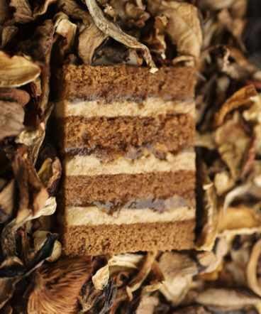 Гречневый бисквит в обрамлении кленового геля с пеканом и взбитым ганашом с грибами.