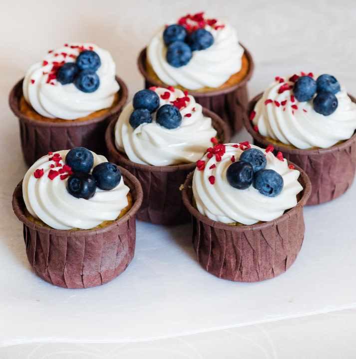 ПП Кокосовые капкейки с ягодной начинкой и шапочкой из крем-чиза. КБЖУ 100г=236ккал (10,5/12,3/21,2).
